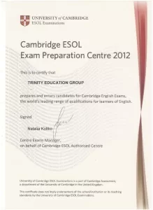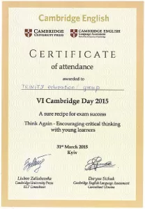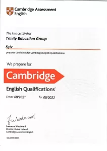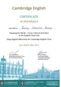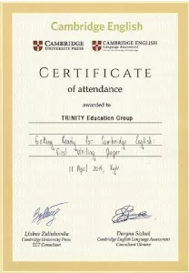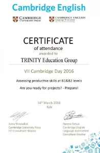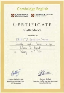 - Сертифікат Кембриджського центру підготовки до іспитів з англійської мови (2013-2025).